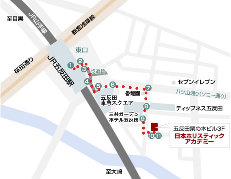 | ■ 最寄駅 | JR五反田駅東口から徒歩2~3分 ●品川駅から来られる場合だと、JR五反田駅まで山手線で約5分です。当スクールはJR五反田駅東口から徒歩2~3分の場所にありますので、品川駅から10分以内でお越しいただけます。 ●東京駅から来られる場合だと、JR五反田駅まで山手線で約16分です。当スクールはJR五反田駅東口から徒歩2~3分の場所にありますので、東京駅から20分以内でお越しいただけます。 ●羽田空港から来られる場合だと、JR五反田駅か隣接する都営浅草線五反田駅まで京急利用で32分~50分程度ですので、羽田空港から当スクールには35分~53分でお越しいただけます。 |